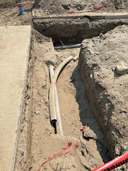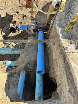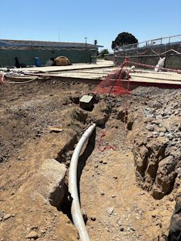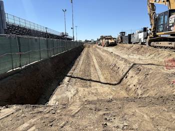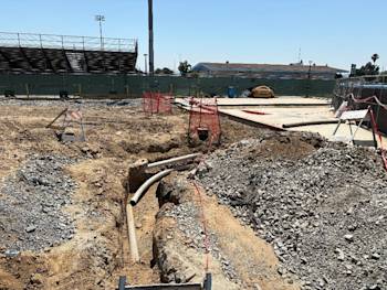 During August, the existing domestic water line was re-routed outside the future exterior basketball courts and underground storage tank areas. Following completion, the system was chlorinated, sampled, and approved. Final P.O.C. connections were completed after hours to avoid impacts to school operations, students, and staff. Over-excavation was performed in areas not affected by existing SCE underground utility pathways. TCC coordinated with the grading/demolition and utility contractors to determine the required excavation depths beneath future foundations. SCE is scheduled to perform a site power shutdown on August 30, 2025. During this time, SCE will remove existing conductors, install new conductors through newly placed conduits outside the building footprint, and re-energize the site the same day. Additionally, the project repositioned the new 84’-0” exterior basketball courts to avoid existing underground utilities that could not be relocated.