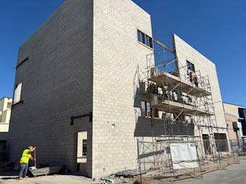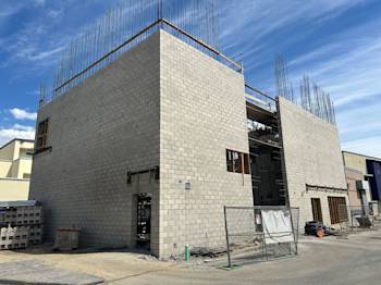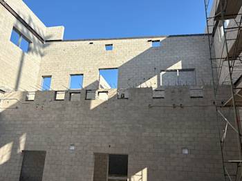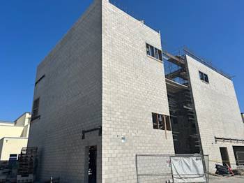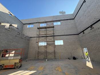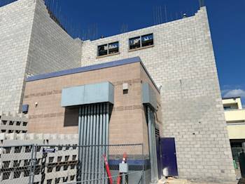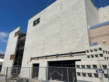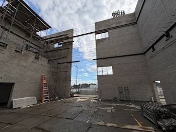 During the month of October, Building U continued CMU block installation and in-wall electrical rough-in, while steel embeds were set as the exterior walls took shape. Toward the end of the month, scaffolding was erected to provide access to the walls.