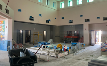 During the month of December, board approval was received, contracts were executed, and construction activities commenced at Building M. Work performed included the installation of temporary fencing, removal of existing kitchen equipment, safing-off of building utilities, and interior demolition of ceilings and walls. By the end of the month, the stage extension for the new ramp was completed, and the interior scaffold for high-ceiling access was erected.