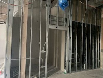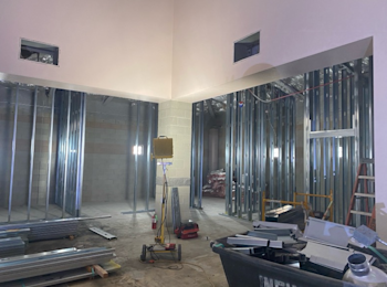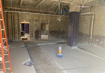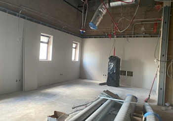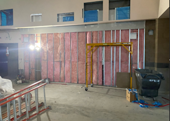 During the month of December, rebar welding and concrete placement for door infills were completed on the first floor. Drywall installation was completed in all office areas, and drywall taping and texturing began on the second floor. AC duct insulation was installed on the first floor, while controls and insulation work continued on the second floor. Hanger wires for the wood ceiling were installed, and required fireproofing repairs were completed. Replacement insulation is scheduled for the first week of January to support continued progress on the floating ceiling. In addition, the AV room and added restroom were framed on the second floor, and new electrical equipment was installed.