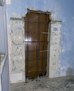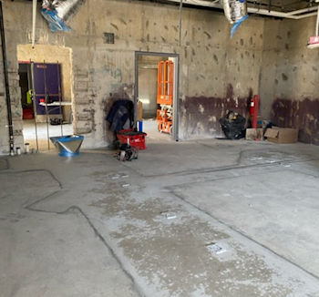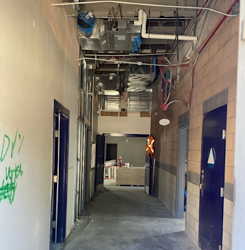 During the month of January, demolition activities in Building M progressed, and wall framing began. Construction work included the demolition of the slab for a new pony wall in the elevated area, removal of the new roof openings, framing of interior walls, and plumbing, electrical, and mechanical rough-ins for the restrooms.