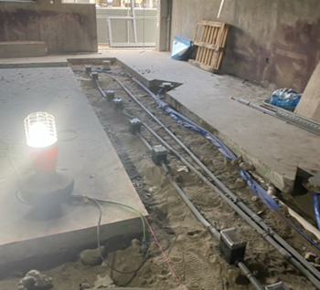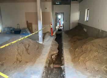 During the month of September, demolition progressed at Building D. On the first floor, underground plumbing lines were installed, along with overhead fire sprinkler mains and branch lines. Layout for louvers and duct installation was underway; avoiding existing rebar during louver layout required extensive coordination. In-wall electrical work also began. On the second floor, wall framing was completed, and in-wall electrical rough-in reached approximately 90% completion.
